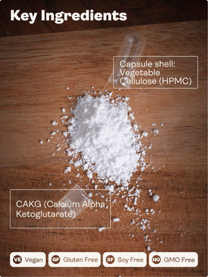 Calcium AKG is a stable, bioavailable form of alpha-ketoglutarate. It combines AKG with calcium for better absorption.
