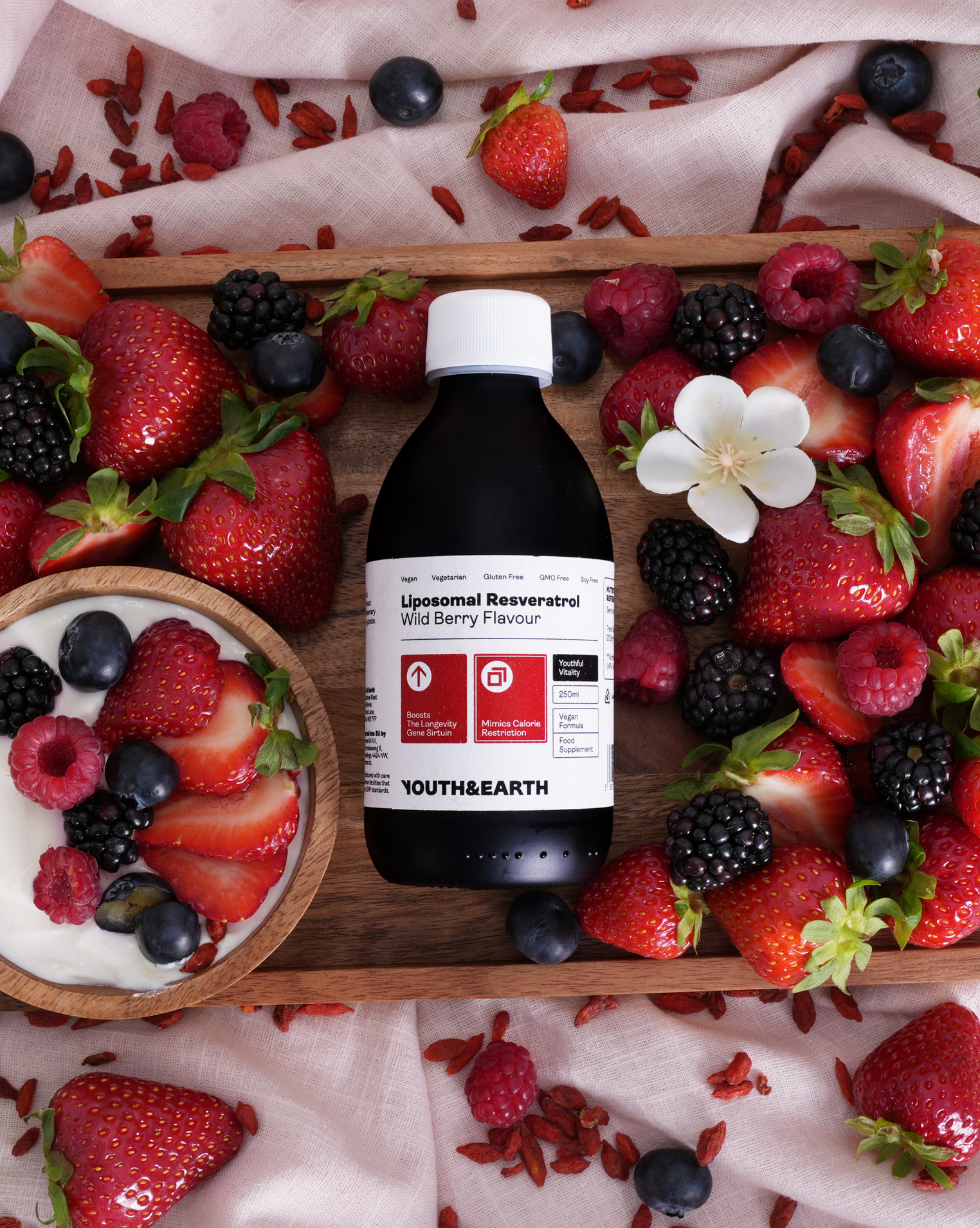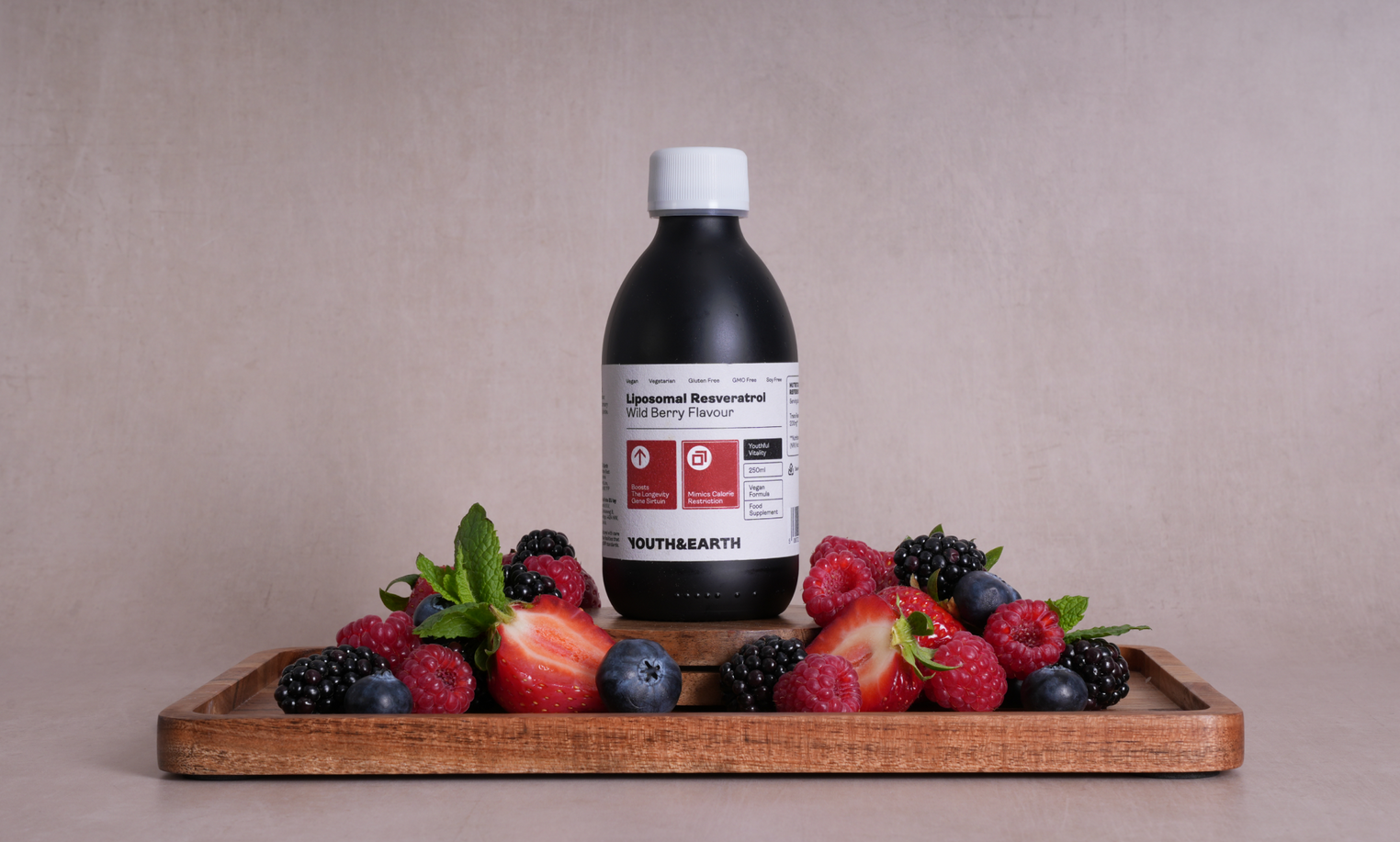 Ingredients : Purified water, Vegan Glycerol (natural stabiliser), Phospholipids, Trans-Resveratrol, Wild Berry flavour, Seabuckthorn extract (natural preservative), Rosemary extract (natural preservative), Citric Acid Monohydrate