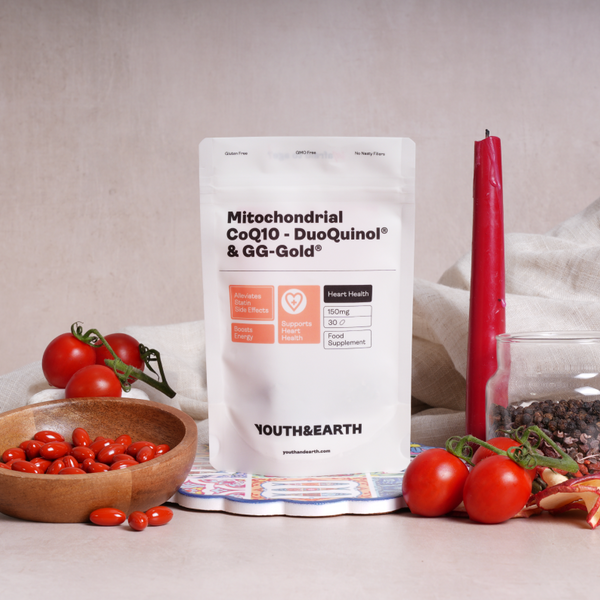 the Youth & Earth Mitochondrial CoQ10 supplement combines DuoQuinol® (Ubiquinol, an active form of CoQ10) with GG-Gold® (Geranylgeraniol) to naturally boost the body's production of CoQ10 and GG. This combination provides powerful antioxidant protection, supports cellular energy, and helps combat ageing. Ubiquinol offers higher bioavailability and absorption compared to ubiquinone, while GG enhances this effect and supports muscle function and strength.