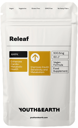 Releaf is an exclusive combination crafted specially for Youth & Earth to support metabolism and balance blood sugar levels. A rich source of Berberine, which activates the AMPK longevity gene — a key component of metabolic regulation. When combined with Silymarin, Berberine has also been shown to enhance cardiometabolic health. To support metabolism and balance blood sugar levels, RELEAF also contains highly absorbable Chromium Picolinate.