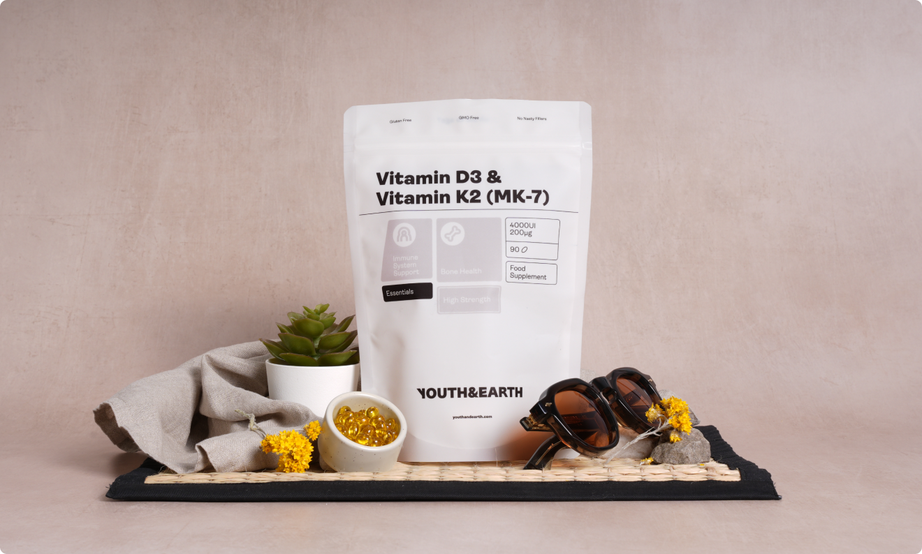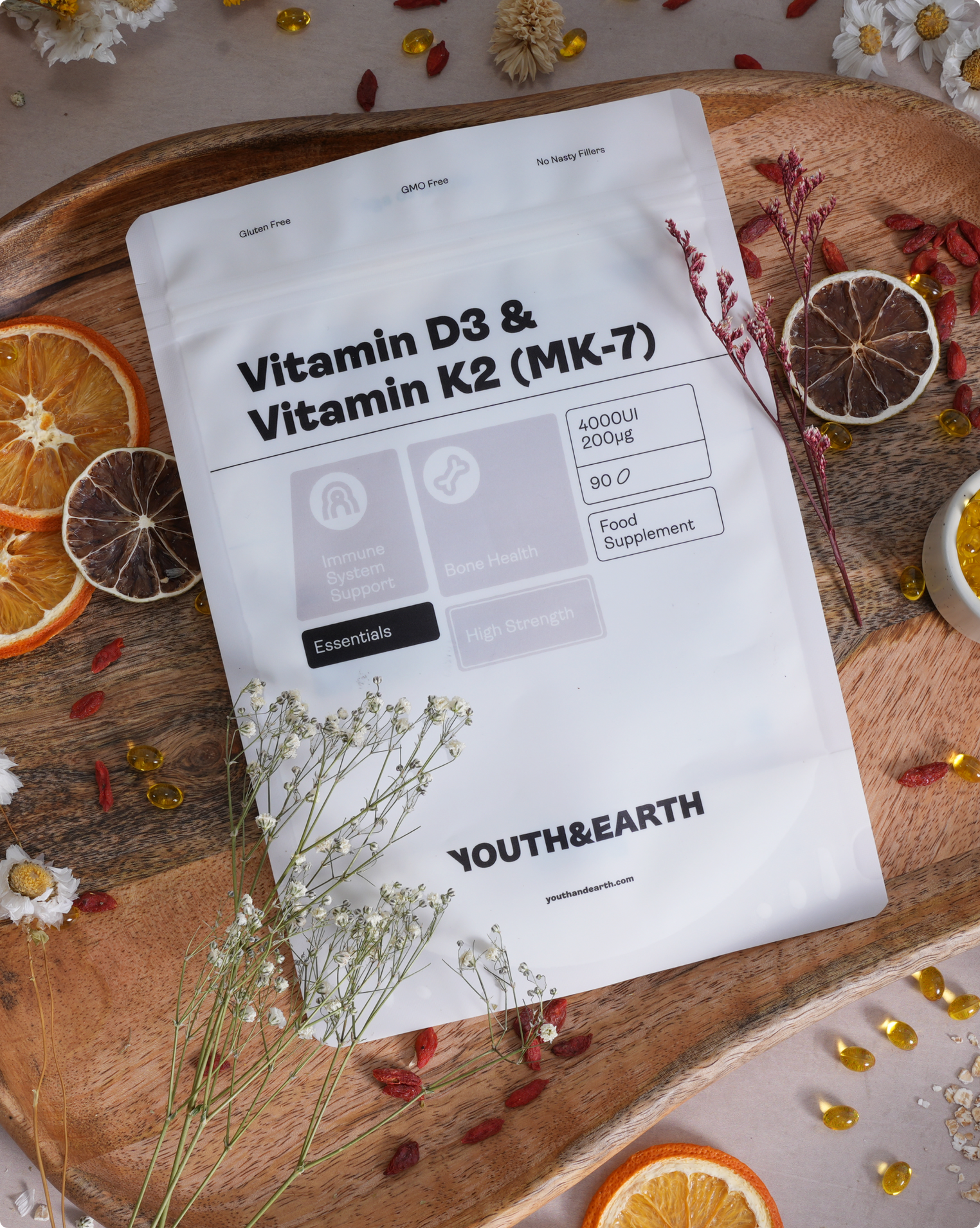 Our Vitamin D3 + K2 supplement is meticulously crafted with high-quality ingredients, including the potent combination of 4000 IU of Vitamin D3 and 200 mcg of Vitamin K2 (as MK-7). Our supplement stands out with its very high strength of 4000 IU of Vitamin D3, ensuring you receive a powerful dose for optimal health benefits. The Youth & Earth Vitamin D3 + K2 is free from lactose, all artificial fillers, colours and flavours, GMOs and soy. Our softgels are designed for easy absorption, ensuring you receive the full benefits of these essential nutrients. Manufactured in the UK in facilities that follow cGMP standards.